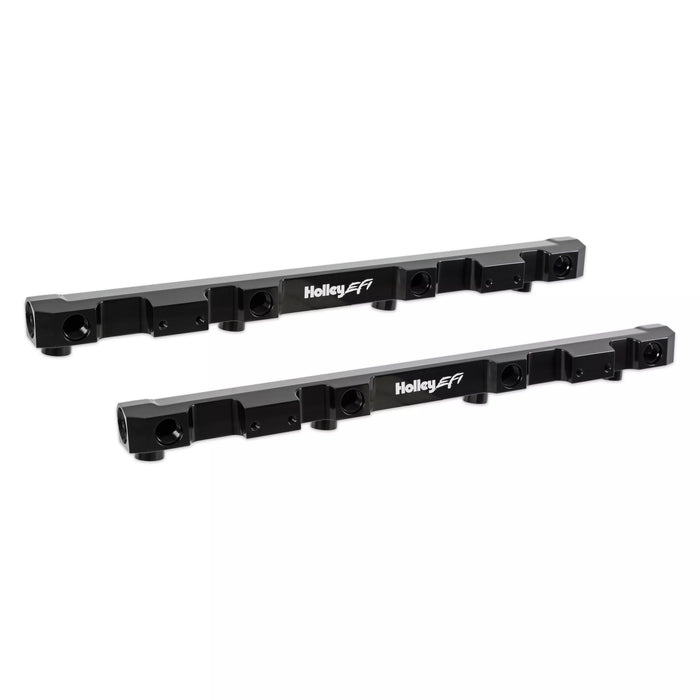 Fuel Rail - Holley EFI - 8 AN Female O-Ring Inlet - 6 AN Female O-Ring Outlets - Plugs / Brackets / Hardware - Aluminum - Black Anodized - GM LS-Series - Kit