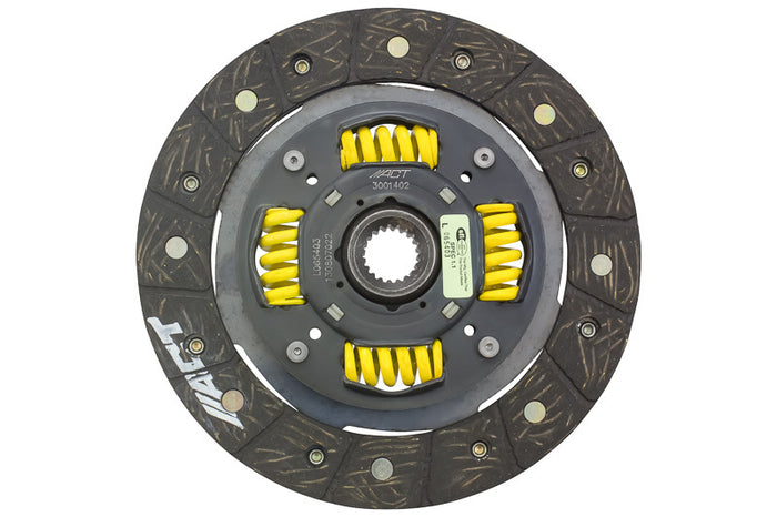 3001402 is a performance street disc and the most popular disc purchased. It features premium organic materials with high copper content for better heat transfer. Performance street discs allow for quicker shifting and smooth engagement. These discs feature a reduced marcel for faster shift action to complement ACT pressure plates. ACT spring-centered assemblies use bushings and cone springs similar to factory clutch discs. This creates frictional dampening, which improves clutch life and reduces noise. Quiet operation with increased strength and reliability.