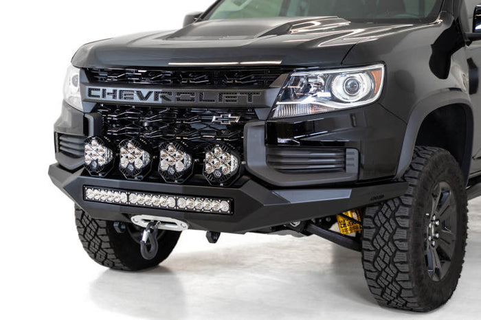 The Stealth Fighter for the Chevy Colorado ZR2 is a low profile front bumper with a radius plate steel design. A 30" universal light mount is tucked within the bumper, giving the option to run any 30" Radius LED bar or up to 8 cube lights. There are 4 additional mounting points for 6" Round Lights along the top of the bumper. A separate mounting plate allows the winch strength to come straight from the vehicle's frame, while reinforced clevis mounts provide a strong point to bolt on 3/4" d-rings. The front fascia will need to be cut for OEM removal, but this bumper is otherwise bolt-on. The OEM skid plate can be reused with minor trimming. As always, this bumper is made in America.