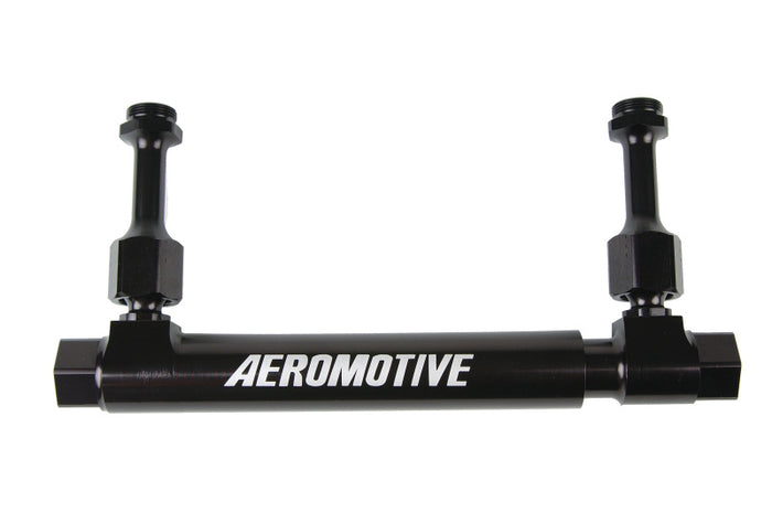Billet, double adjustable, carburetor fuel logs for superior fitment. The advantage of a company that understands engineering, design, and manufacturing, is peace of mind. When you buy a fuel log from Aeromotive, you can be assured they will fit and deliver as promised. Threaded with 7/8? ? 20 with flat gasket for proper sealing on carburetors like the standard Holley and those with similar float bowls. Carburetor inlets swivel + or ? 20 degrees in all directions for optimum clearance from valve cover and intake runners. Telescoping center line is 7.700? to 13.450? adapts to standard and high capacity float bowls. ORB-10 inlet and outlet ports can be adapted from AN-12 to AN-06 with available Aeromotive ORB port fittings. Two 1/8? NPT ports for gauges and/or pressure transducers. 1.056/.806? ID bore for high flow capacity. Type II bright-dip black anodized finish for durability and great looks.