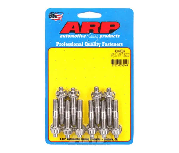 ARP stainless steel accessory studs can be used for exhaust systems, intake manifolds, and a number of other uses. They are made of ARP's stainless 300 and are impervious to the rust and corrosion that plague ordinary fasteners. The studs feature a unique nut starter nose and a hex broached tip, allowing them to be easily installed using an Allen wrench. Stainless steel 12-point nuts and washers are included. Give your engine a show quality look with ARP stainless steel accessory bolts.