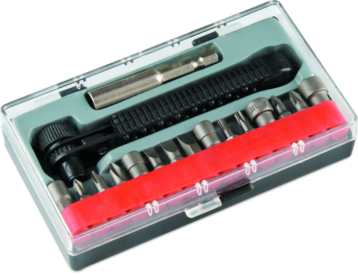 The BikeMaster® Mini-Ratchet Wrench Set has all of the most popular sizes and types included in a carrying case ready for your use. The set comes with five crosshead, three head, two Torx head, five sockets and extension.
