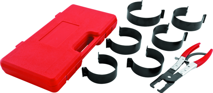 Packed in a heavy-duty carrying case, the kit comes with locking band pliers with textured non-slip grip and six bands for pistons ranging from 2-7/8 to 4-3/8 in., 73 to 111mm. The locking band pliers, which feature a fine locking ratchet allowing precise adjustments of thering bands. The rings fit a wide range of motorcycles, from dirt bikesto big V-Twins, from 2-7/8 to 4-3/8 in., 73 to 111mm cylinder bores,all-in-one kit. Piston ring bands are identified with bottom of cylindermarkings for easy installation.