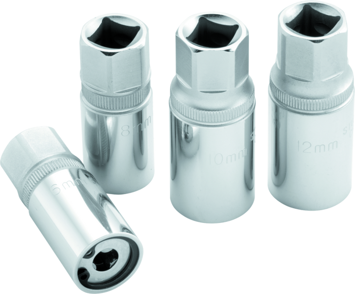 The BikeMaster® Stud Removal Sockets can install studs too! These removal sockets allow you to grip a larger area with bi- directional rollers to confidently remove or install the studs. The socket slips over the stud protecting it and allows you to use the force necessary to break the stud free. There is no risk of open- ended wrenches slipping off.