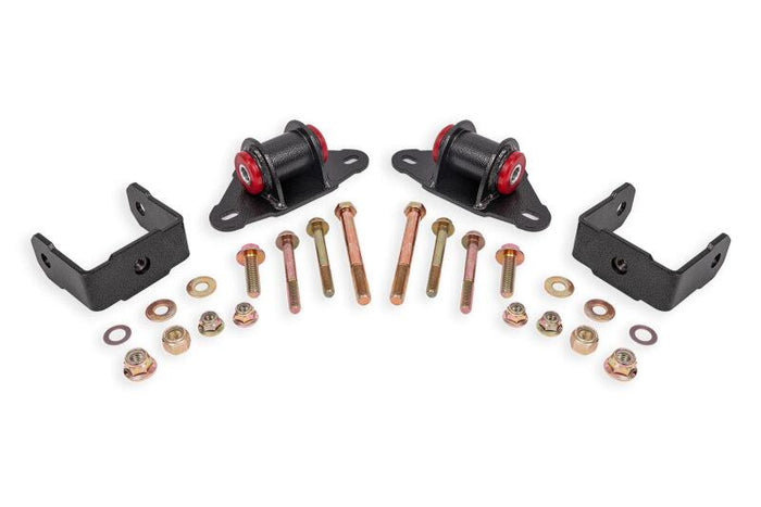 Transmission mounts are used to keep the transmission in place and absorb energy from it. However, factory transmission mounts often do little to minimize transmission deflection, resulting in lackluster throttle response, slower reaction times, and less accurate shifts in cars with manual transmissions. BMR Suspensions Polyurethane Transmission/Differential Mount Kit (TM570) is built to reduce transmission deflection and designed for drag racing, street performance, and handling applications. When performance is a must, rely on BMR Suspension!