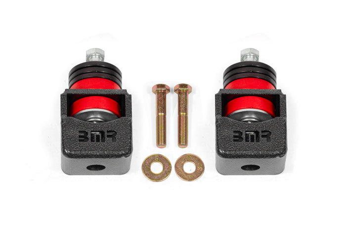 Engine movement (deflection) is wasted horsepower, and that power is yours! BMR Suspension wants you to take it back with its polyurethane motor mounts for 2008-2009 Pontiac G8s and 2014-2017 Chevrolet SSs. BMR’s new motor mounts (MM300) are far superior to the bulky, oil-filled hydraulic stock motor mounts, which are designed for comfort, not performance. BMR manufactures its MM300 polyurethane motor mounts in its Florida facility from MIG-welded ¼-inch plate steel with 6061 billet aluminum machined spacers and 95-durometer polyurethane bushings. The kit is completed with Grade 10.9 hardware. BMR Suspension designed the MM300 to be the perfect (100% bolt-in) motor mount for any power level or application (street performance, drag race, and road race) where engine deflection needs to be reduced. The factory hydraulic motor mounts are designed to dampen engine vibration, giving you the smoothest and most comfortable experience possible. Unfortunately, this does little to limit engine movement. This deflection means lackluster throttle response, slower reaction times, and less accurate shifts in manual-equipped cars. BMR’s MM300 polyurethane motor mounts limit engine deflection, while isolating much of the engine vibration from the vehicle’s occupants. This means you won’t feel a big increase in NVH. The reduction in deflection leads to more power transferred to the tires, improving your driving experience on both the street and track. And less drivetrain movement means more accurate shifts as you row through the gears. The MM300 is also height adjustable. Simply remove a single aluminum spacer on each side to lower the engine a ¼-inch and two aluminum spacers on each side to lower it a ½-inch in the engine bay. This will give increased under-hood clearance for a strut tower brace or supercharger, and a lower center of gravity for improved handling. When performance is a must, rely on BMR Suspension! BMR Suspension’s MM300 polyurethane motor mounts are available in red and black hammertone powdercoat for long-lasting good looks in your car’s most harsh environment. Installation time is about 2-3 hours with stock exhaust manifolds (installation time may be longer with aftermarket headers). Proudly made in the U.S.A.