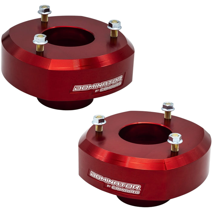 Camburg's Dominator Preload System is a game-changer in the leveling suspension market. It replaces the top hat of OE shocks with a one-piece billet aluminum design that not only preloads the coil spring but also provides added lift. This innovative system ensures that suspension, steering, and driveline components operate within OE working limitations, preventing wear and failures. The added lift and preload allow for larger tires, increasing ground clearance and improving approach angles. It also offers better bottoming control and minimizes front end dive and body roll while maintaining a plush ride. CNC machined from aerospace 6061-T6 billet aluminum, red anodized, and laser-etched, the Dominator Preload System is a high-quality product. It includes all necessary hardware for a hassle-free installation and is suitable for both seasoned off-road enthusiasts and weekend warriors. Upgrade your stock vehicle for your next off-road adventure with Camburg's Dominator Preload System.
