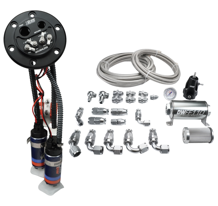 X2 Series Fuel Pump Hanger with dual DW420 fuel pumps and PTFE plumbing kit for 1992-2000 Honda Civic, and 1994-2001 Acura Integra