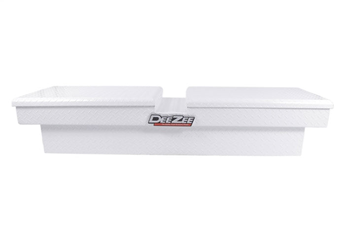 Dee Zee Tool Box - Red Label Double Lid (Gull Wing) Crossover. Constructed of heavy duty Brite-Tread aluminum. White powder coat; provides a white finish while it protects and prevents oxidation. Crown style lid for superior rigidity. Other features: lockable stainless steel paddle handles; dampened gas shocks; closed cell foam gasket; and self-adjusting strikers. Removable plastic tool tray to help keep small items organized.