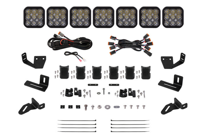 Included in the box: Seven (7) Stage Series 5inch LED pods. One (1) Roof rack mounting kit. Two (2) CrossLink support bracket kits. Six (6) CrossLinks with hardware. One (1) CrossLink endmount kit. One (1) CrossLink splitter harness. One (1) Heavy-duty single-output wiring harness.
