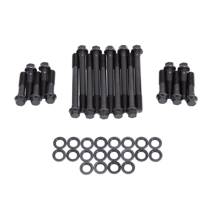 Edelbrock E-Series Cylinder Head Bolt Kit #85772 is a high-quality replacement bolt set for Chrysler 5.2L and 5.9L Magnum engines equipped with Performer RPM #61779 and #61775 aluminum heads. This kit contains all necessary parts to replace the factory head bolts. E-Series bolts have a yield tensile strength of 190,000 PSI for strong and reliable loading with generous filleting throughout to eliminate stress risers. Bolt threads are rolled after heat-treating for superior form and strength, while a small hex head provides extra space for socket clearance in tight situations. E-Series Cylinder Head Bolts have a durable black oxide finish with sealer and come with the distinctive Edelbrock “E” stamped into the head.