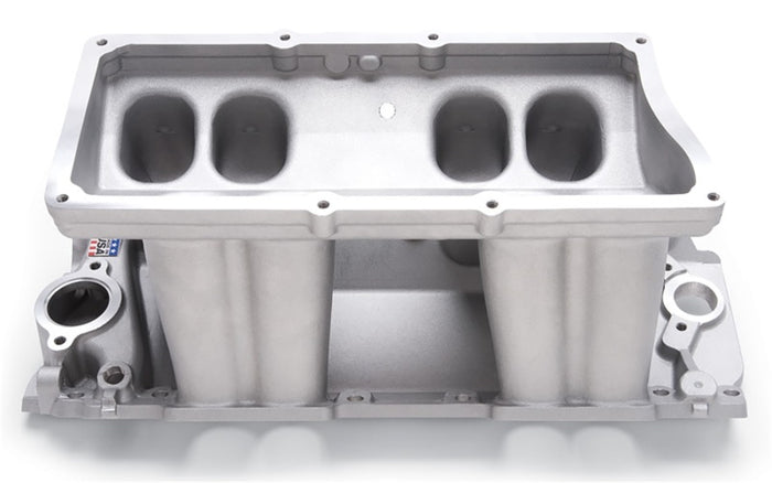 VICTOR TUNNEL RAM (4500-8500 RPM) This Victor Tunnel Ram is a modern updated design to our very successful Victor Ram 2-R Tunnel Ram, which was first released over 35 years ago. It's designed for use with 468-582 c.i.d. standard-deck Chevrolet V8 engines with conventional rectangular port cylinder heads. This new and improved design has 7" long runners with close to 5.5 square-inches at the plenum, making it 25% larger than our current Victor Ram 2-R Tunnel Ram base! This is the ideal intake manifold for any modern high horsepower demanding application. Will fit Edelbrock Victor series race cylinder heads #77409, #77459 and #77609. Available for carbureted and fuel injected applications. The Victor Tunnel Ram top is for use with 4500 series carburetors and our new Victor Tunnel Ram base manifolds only. It's designed with larger openings to accommodate throttle bore sizes up to 2.31" without modification and is wider to accommodate the larger runners in the new manifolds. Carburetors will need to be mounted sideways in order to clear and will work with throttle linkage kit #7077. Fuel rail kit ends are machined for -8 AN fittings and feature a black anodized finish. Fuel rails do not have any provision for a plug-in style fuel pressure regulator. Crossover and regulator not included.