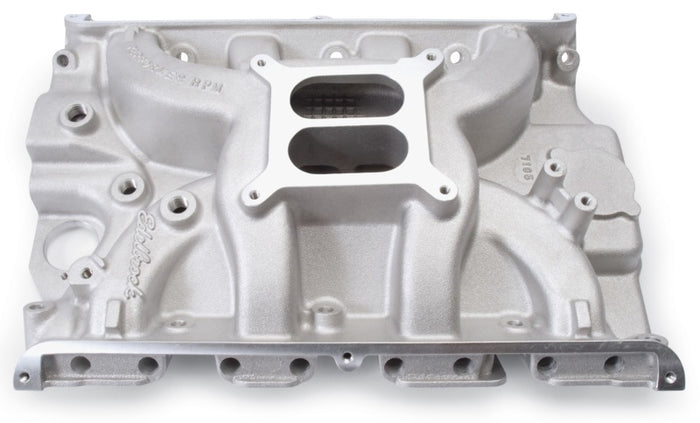 PERFORMER RPM FE (1500-6500 RPM) Designed for high-performance street 390-406-410-427-428 c.i.d. Ford FE V8's with standard 390-428 c.i.d., 427 low/medium-rise or Edelbrock Performer RPM FE heads. The dual-plane constant cross-sectional area design builds low and mid-range acceleration while optimized runner paths make exceptional top-end horsepower. Has provision for adding the PCV or breather flange at rear. No exhaust crossover passage. Also available as a complete manifold and carb kit. * CARB RECOMMENDATIONS: Edelbrock Thunder Series AVS or Performer Series (650-800 cfm) Carburetor. For auto. trans. use our #1483 or #1844. ** Recommended intake gasket: Edelbrock #7224. Manifold height: A-4.89", B-6.04"; Carb pad height: 5.46". Port exit dimensions: 1.16" x 1.97". For the heights of all Edelbrock manifolds, please use the Manifold Reference Dimensions guide.