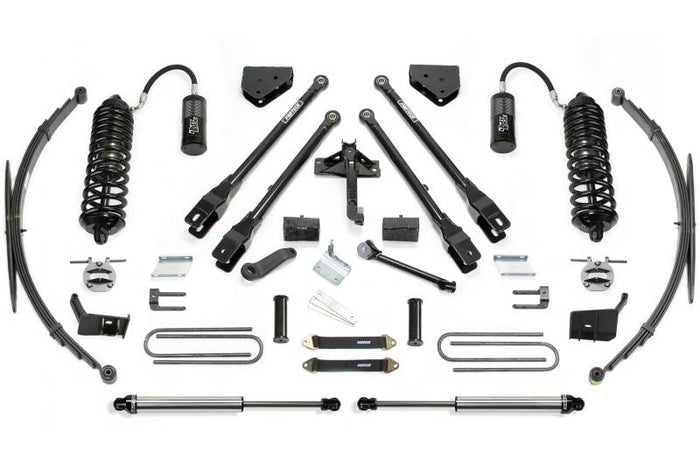 Fabtech?s 4 Link Conversion system for the Ford Super Duty has been designed to provide improved on road performance with the ability to tackle the most rugged offroad terrain. This high end system is a bolt on replacement to the factory Radius Arm suspension and comes with everything needed to convert to a 4 Link front suspension. The system will provide less caster change throughout the travel range which benefits on road driving. Offroad the 4 Link system will provide more articulation than a Radius Arm for increased terrain traversing at all speeds. Included in this system is the massive Dirt Logic 4.0 Coilover Conversion for outstanding damping capacity offroad with a quality on road ride. The Coilover bolts in place of the factory coil spring without removal of the coil spring bucket. The giant 4" diameter aluminum remote reservoir mounts horizontally above the Coilover to allow for full compression travel with oversized tires. The Dirt Logic 4.0 Coilover is the biggest and baddest on the market for the Ford Super Duty. Fabtech?s 4 Link System has been proven in over 10 years of service in military applications. High quality components with properly designed suspension geometry is the pinnacle of Super Duty suspension systems. System includes a free 5 year 60,000 mile powertrain warranty.