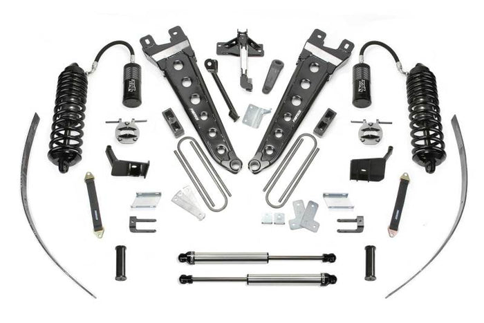 Fabtech?'s Radius Arm system for the Ford Super Duty is built to handle the on and offroad demands of the truck enthusiast. This system is a complete upgrade to the factory suspension and will provide additional strength for use with oversized tires. The heart of this quality system is Fabtech's tubular Radius Arms. The design of these arms comes from Fabtech race components built with a tubular structure reinforced by a dimple die side plate and heavy gusseting for rugged offroad use. They are a superior upgrade to the stock stamped arms. Included in this system is the massive Dirt Logic 4.0 Coilover Conversion for outstanding damping capacity offroad with a quality on road ride. The Coilover bolts in place of the factory coil spring without removal of the coil spring bucket. The giant 4?? diameter aluminum remote reservoir mounts horizontally above the Coilover to allow for full compression travel with oversized tires. The Dirt Logic 4.0 Coilover is the biggest and baddest on the market for the Ford Super Duty. High quality components with properly designed suspension geometry is what sets this system apart from all other Radius Arm suspensions. System includes a free 5 year 60,000 mile powertrain warranty. Each Fabtech component has been designed with specific features and benefits that create this quality suspension system.