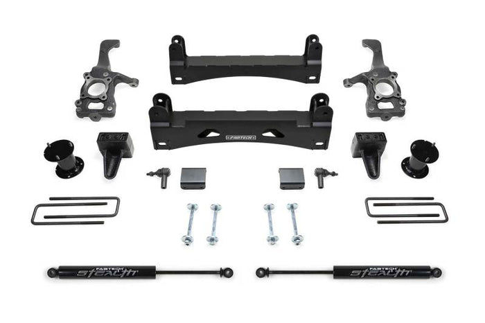 This system feature Fabtech?s proven IFS technology with extended length ductile iron steering knuckles for proper Ford electronic stability control functionality. Heavy duty 1/4? thick steel lower control arm crossmembers provide superior ground clearance for adventurous offroad trails. Rear lift is accomplished with a 2.25? lift block and extended length u bolts. The Basic System includes front coilover spacers that utilize the factory Coilover shocks for a stock like ride characteristic. This high quality system does not require drilling or cutting for installation and comes Fabtech?s 5/60 Powertrain warranty. 1/4? thick steel lower control arm crossmembers are arched for maximum ground clearance. Four adjustable alignment cams provide a wide range of adjustment. The fully welded box design of these crossmembers provides additional strength to the front suspension. Extended length ductile iron steering knuckles retain near stock track width keeping the tires under the fenders. These steering knuckles are designed to work in conjunction with the Ford ESC for proper functionality at all speeds. Thick wall tubing and 1/4" thick steel plate is used to build these 4? lift spacers that retain the factory Coilover shocks for a stock ride. Brake Line Brackets reposition the factory Ford brake lines down on the frame for the new travel range without having to open the brake system. Keeps factory fluid system intact. 1/4" thick steel drop brackets reposition the front sway bar for the increased ride height. This allows the sway bar link ends to fully cycle without binding throughout the extended travel range. 5" Tall rear lift blocks replace the factory blocks without changing the ride quality or load carrying capacity. American made U Bolts that retain the entire rear differential to the vehicle. In the rear, extended length monotube Stealth shocks have a Nitrocarb piston rod for corrosion resistance and resist rock chipping.