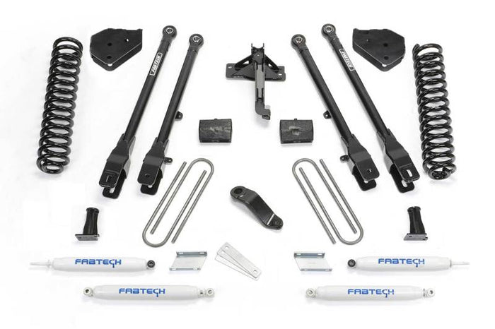 Fabtech?s 6? 4 Link Conversion system for the Ford F450 and F550 Super Duty is built to handle the on and offroad demands of the truck enthusiast. This vehicle?s suspension is more robust than the Ford F250 and F350 and therefore demands specialty parts only available from Fabtech. This system comes with everything needed to convert to a 4 Link front suspension. The system will provide less caster change throughout the travel range which benefits on road driving. Offroad the 4 Link system will provide more articulation than a Radius Arm for increased terrain traversing at all speeds. Fabtech?s 4 Link System has been proven in over 10 years of service in consumer, commercial and military applications. High quality components with properly design suspension geometry is the pinnacle of Super Duty suspension systems. Each Fabtech component is expertly built in house. Fabtech Heavy Duty Link Arms. Fabtech Front Coil Springs. Trac Bar Relocation Bracket. Sway Bar Drop Brackets. Pitman Arm. Rear Block & U-bolt Kit. Includes front and rear Performance shocks.