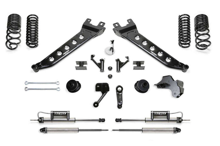 Improving on the Ram suspension design, Fabtech offers their trademark Radius Arms in a complete lift kit. These exclusive tubular Radius Arms have recognizable dimple die side plates for superior strength and a signature of quality. The rugged Arms provide increased caster for use with oversized tires and lifted suspension heights. For maximum suspension damping, this Ram lift kit features the massive stainless steel Dirt Logic 4.0 Coilovers. These top shelf Coilovers bolt to the factory upper coil bucket with support gussets for superior strength. The lower mounts weld to the axle housing and have cross support gussets for the factory Track Bar bracket. Heavy duty 1/4" thick steel front and rear Track Bar drop brackets center the axles under the vehicle with the new ride height. For the rear, this lift kit has the perfect balance between ride quality and retaining the factory carrying capacity. By utilizing a dual rate spring design, it provides a good highway ride in the first stage of compression then the second stage handles heavy loads. This high end lift kit system is the ultimate suspension upgrade for Ram 2500. FEATURES: Fabtech?s trademark Radius Arms with recognizable dimple die side plates providing additional strength and increased caster. Bolt on Ram Coilover Conversion for the best ride quality on and offroad. Heavy duty Track Bar drop brackets center the axles under vehicle for proper tracking. Dual rate rear coil springs for factory load capacity and a smooth ride. Includes Free 5 year 60,000 mile Powertrain warranty. RADIUS ARM: Tubular construction with dimple die side plates for superior strength. Arms are offset to allow for full turning radius with wide tires. Fabtech Radius Arms have 1 degree of caster built in for the increased ride height. Adjustable alignment cams on the Arms allow for an additional 1.5-2 degrees of caster adjustment over stock. FRONT DIRT LOGIC 4.0 RESI COILOVERS: Super stout 1/4? thick steel brackets utilize