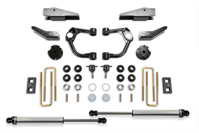 This quality 2019 Ford Ranger Upper Control Arm system is perfect for owners looking to increase ride height to run slightly larger tires than factory. The system will provide additional wheel travel with no suspension bind at full droop. Lift is accomplished with steel spacers that utilize the factory Coilover shocks for a stock like ride. Fabtech's Upper Control Arms address the geometry of the front suspension with the new ride height for proper align ability. Heavy duty ball joints allow for extended suspension travel to eliminate binding. The system has been designed for proper CV axle angle and plunge thus eliminating the need to reposition the front differential. Included in this system is Fabtech's Offset Intrusion Beam Kit that allows use of 33" tires. The factory Intrusion Beams are located in the front fenderwells, forward and back of the tire. They limit the size of the tire you can install while being an integral part of the front collision safety impact feature of the vehicle. Rather than modifying or removing the Beams for tire clearance, Fabtech provides replacement Offset Intrusion Beams. They are constructed of 1/4" thick steel and are a welded box design for maximum strength. They allow full steer with 33/1250R tires w/ a 5" back space wheel. Rear lift comes from 1.5" blocks and u-bolts.