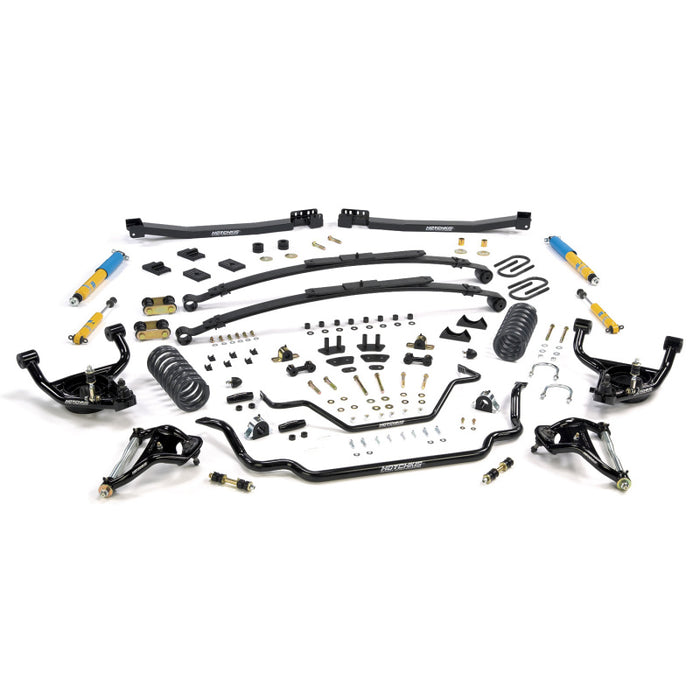 Hotchkis Sport Suspension 80017-2 Stage 2 TVS Kit Extreme with 2 in. drop for 1970-1973 Camaro and Firebird Coupes with Small Block motors. Includes Adjustable Rear Sway Bars 1 3/8 in. Front and 7/8 in. in rear with Chassis Max Sway Bar Brace 2 in. Lowered Sport Springs 1.5 in. Lowered Leaf Springs (3 Inch Kit Also Available) and Front and Rear Hotchkis Tuned/Bilstein Shocks Sub Frame Connectors (Chassis Max Brace Also Included on Convertible Kits) all necessary Hardware and Bushings with Heavy Duty Tie Rod Sleeves also included. One Convenient Kit for the ultimate handling GM F-Body Camaro or Firebird nothing beats the Hotchkis Sport Suspension Stage 2 Total Vehicle System. This kit has been rigorously designed and tested on the track yet is very comfortable for your local cruise in. Every aspect of the suspension has been re engineered for the maximum performance and is being offered in a complete tuned package. In front we start out with Tubular Upper and Lower Control Arms which increase caster and improves the camber curve creating more front end grip and traction. Heavy duty tie rod sleeves hold the alignment while 2 in. (3 in. also available) lowered sport springs and Hotchkis Tuned/Bilstein shocks improve vehicle control and stance. A massive 1 3/8 in. front sway bar and 7/8 in. adjustable rear sway bar reduce body roll and improve handling. To improve traction and reduce wheel hop the rear gets a 1.5 in. (3 in. also available) multi leaf drop spring which features a Hotchkis exclusive design that utilizes an overload spring to reduce axle wrap up. The kit comes complete with heavy duty shackles u-bolts pads and all necessary hardware. To stiffen the chassis Hotchkis includes sub frame connectors and a rear sway bar cross member creating a complete package. This system is a proven autocross winner and designed for maximum performance improvement in a installer friendly kit. PROUDLY MADE IN THE USA