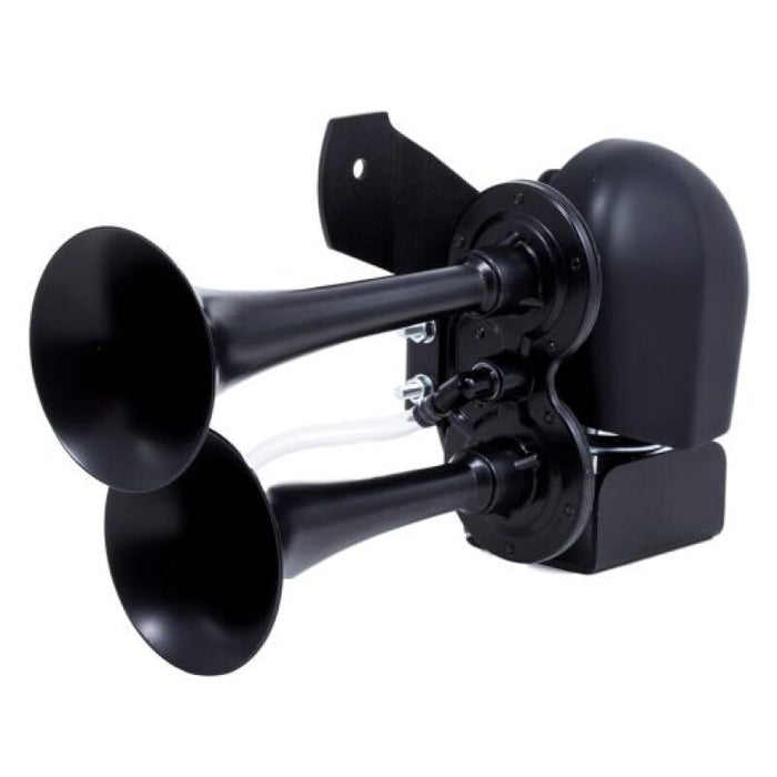 The Hog Kit Direct Drive Horn System for Harley Davidson motorcycles completely replaces the factory horn assembly and reuses the bike's factory horn cover for a clean, better-than-factory appearance. Works on 1978 and later Harley Davidson motorcycles with the classic "Cowbell" style horn cover. Includes dual black air horns and uses a direct drive compressor to produce a 132 dB blast.
