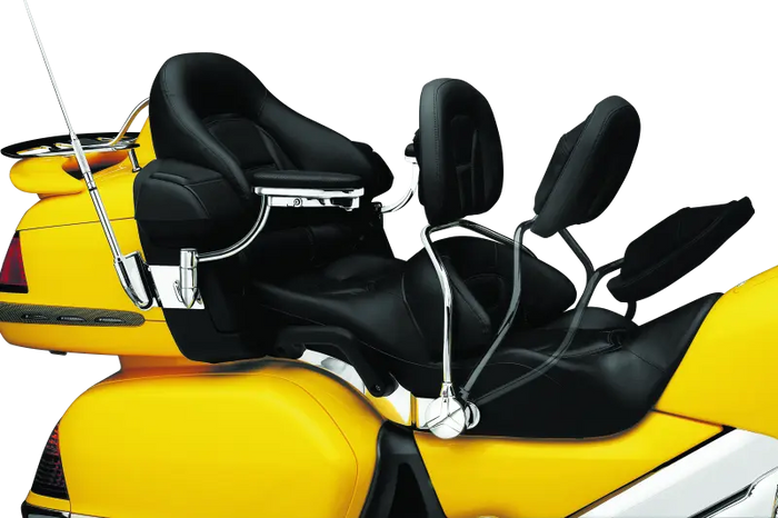 Ultimate comfort for the GL1800 rider! Hours in the saddle will feel like minutes in your favorite easy chair when you cruise with our Rider Backrest. Quick release mounts allow easy removal & adjustability to suit each rider. The entire backrest pivots forward at it's anchor points for smooth operation & easy access to the passenger seat.