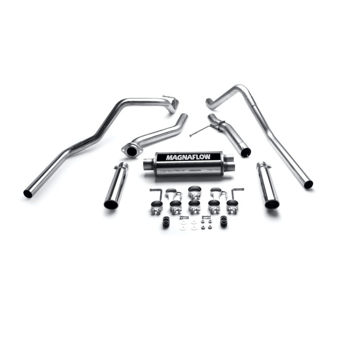 The MagnaFlow Street Series 15754 brings out the personality of your Truck with our signature resonant, powerful engine tone and dyno-proven performance. Thanks to its fast-flowing, mandrel bent 3in. main piping and 1 Straight-Through mufflers ending in a Dual Split Rear exit with 3.5in. Polished Clamp-On-Single Wall-Angle Cut-Rolled Edge tips, this Truck exhaust kit has the performance chops to match its sporty sound and appearance. Upgrade your ride to the next level with an exhaust that has the pipes to put other Truck’s to shame. With this system your vehicle will be producing Agressive exterior and Moderate interior sound levels while leaving other cars and trucks feeling envious at every stoplight. Exhaust kit 15754 features a cat-back layout that replaces your ride’s stock exhaust components from near the catalytic converter on back. Extensive 3D scanning during development has resulted in a direct-fit design that you can easily install yourself. 15754 is produced using CNC precision robotic manufacturing techniques and is backed by MagnaFlow’s 1-year limited finish warranty and limited lifetime construction warranty.