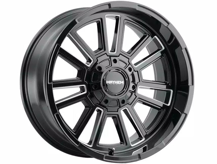 The wheel is covered in a gloss black finish that is offset by the milled spokes and the inset accents on the lip. The center cap is adorned with the Mayhem logo to complete the look.