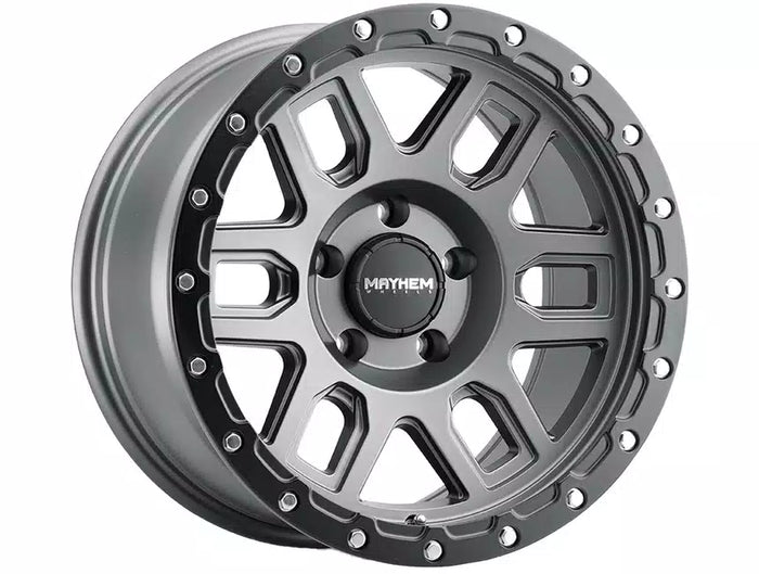 The wheel is covered in a matte gunmetal finish that is enhanced by the black, simulated beadlock ring. The center cap is adorned with the Mayhem logo to complete the look.