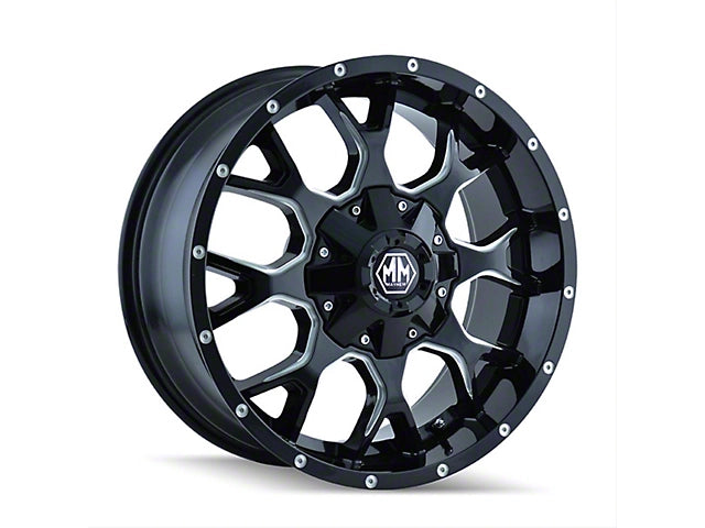 Black with Milled Accents. This Mayhem Wheel features milled accents and a high quality black finish for aggressive good looks that everyone will be envious of. For added protection and good looks, this Wheel features a durable, clear coat that is tough enough to stand up against the hazards of everyday driving - including road chips and pitting.