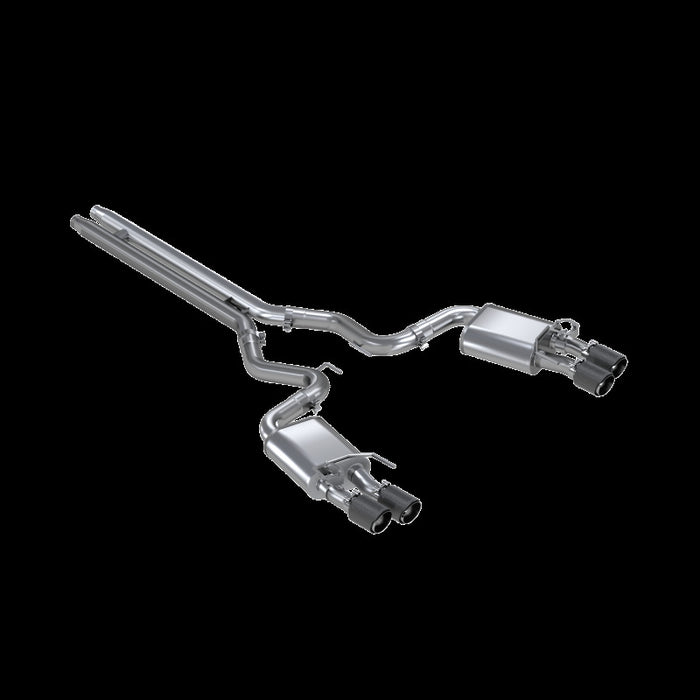 This MBRP(R) dual quad rear exit performance exhaust design on the Ford Mustang GT 5.0L with its innovative design including 3" Mandrel-bent tubing allows for a +35% increased in flow over stock in track mode. This aftermarket exhaust system is carefully engineered to stay true to the Ford Mustang Active design which has 4 modes for Active exhaust. The 4 modes are Quiet, Normal, Sport and Track and the MBRP Active exhaust makes an incredible difference in both design and sound. The exhaust system is equipped with straight-through sound absorption mufflers and a Helmholtz Resonator that keeps the Drone level minimal for perfect highway driving conditions. We love the Ford Mustang OEM Active system. Quiet mode start up definitely keeps the neighbours happy for those early morning engine starts. Knowing that Sport Mode or Track mode is available with the Mustang Active exhaust, it takes your driving experience to a new level at the track or simply cruising the streets. The MBRP(R) Ford Mustang Active exhaust system uses larger piping compared to the factory exhaust system with 3" O.D. mandrel-bends T304 stainless steel piping which includes a Limited Lifetime warranty. At MBRP we stand behind the quality of work with excellent craftmanship and welding by MBRP welders. The Ford Mustang GT exhaust tips come in T304 stainless steel with a Carbon Fiber shell and MBRP logo centered on top for each tip. This is really the cherry on top for this Cat-back Dual Quad Split rear exit performance exhaust system and blends in with rear bumper perfectly. Ford(R) and Mustang enthusiasts should consider this exhaust system based on quality and overall sound upgrade that matches the race design of the Ford Mustang GT.