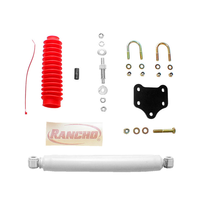 El amortiguador de la dirección sencillo Rancho® es un kit completo con un estabilizador de la dirección Rancho y los soportes que se requieren para la instalación. Los estabilizadores de la dirección reducen la acción de oscilación de las llantas de los camiones y vehículos utilitarios deportivos con llantas sobremedida y elimina el problema de vibración común causado por las llantas más grandes. Los estabilizadores de la dirección también mejoran la facilidad de maniobrabilidad, con lo que se reduce la fatiga del brazo de la dirección. El estabilizador de la dirección lleva una garantía de por vida para brindar confianza al consumidor.