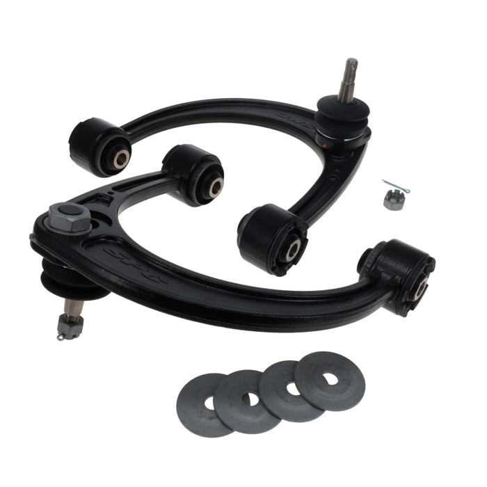 Designed, engineered, tested, and assembled in Colorado, SPC Performance adjustable upper control arms are loaded with impressive features. Improve suspension travel, handling, and tire wear while centering the tire in the wheel well for maximum clearance needed for oversized tires. Now equipped with maintenance-free ball joints and free-pivoting xAxis™ sealed flex joints in bonded rubber sleeves, for correction of alignment angles and restoration of factory ride quality. A Forged steel design provides the strength and durability needed for the most demanding environments. SPC adjustable control arms have improved clearance to get around the spring bucket and a full 80° of articulation in the ball joint - more than any other offering available. When trucks are lifted, caster and camber angles are affected that can lead to poor handling characteristics such as ‘wandering’. SPC control arms have positive caster built-in for lifted vehicles to restore alignment angles and driveability. The patented ball joint design allows the tire to be positioned correctly in the wheel well and additional adjustment in the OE lower arms can maximize placement for oversized tires to avoid fender trimming. If replacement lower adjustment cams are needed, see part #25440 or #25435 depending on year. Sold as pairs. US Patent No. 7,513,514.