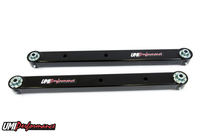 UMI's boxed lower control arms utilize our Roto-Joint technology for a bind free performance and quiet comfortable ride quality. The boxed control arms are fabricated from 0.120†wall thickness rectangular tubing, CNC machined drawn over mandrel bushing holders and MIG welded end caps to keep out unwanted road debris. Each control arm features the correct provisions for adding a stock or aftermarket rear sway bar, sway bar holes are reinforced with a 0.120†wall thickness steel sleeve that is TIG welded and sanded into place. The solid construction combined with the delrin lined Roto-Joints eliminate control arm flex and bushing deflection for improved traction and reduced wheel hop. The Roto-Joint design is a pivot ball lined with a greaseable delrin race designed to offer 28 degrees of total unrestricted movement, more than adequate for a bind free, low friction operation. The Roto-Joint design improves performance over the factory rubber and aftermarket polyurethane bushings by allowing the suspension to articulate correctly, and provide precision handling. The installed UMI Roto-Joint allows rear end free movement when high handling, auto cross or road race is a concern while still being a 100% streetable setup. The installed delrin race, which lines the spherical ball, absorbs shock and road noise for a quiet and smooth operation on any street or track driven vehicle. This control arm set features Roto-Joints on both sides of the control arms. This is designed for maximum performance and suspension travel. Roto-Joints are greaseable and low maintenance making an excellent street setup for your cruiser or race car!