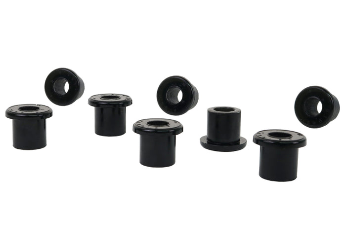 A critical service item for any leaf sprung vehicle. High kilometres and heavy load carrying causes excessive wear on rubber bushings. Whiteline's signature black bushings are made tough and offer outstanding abrasion resistance, high load bearing capability (4WD's, utes and towing), flexibility, increased tensile strength and chemical resistance to oil, grease, ozone and weathering.