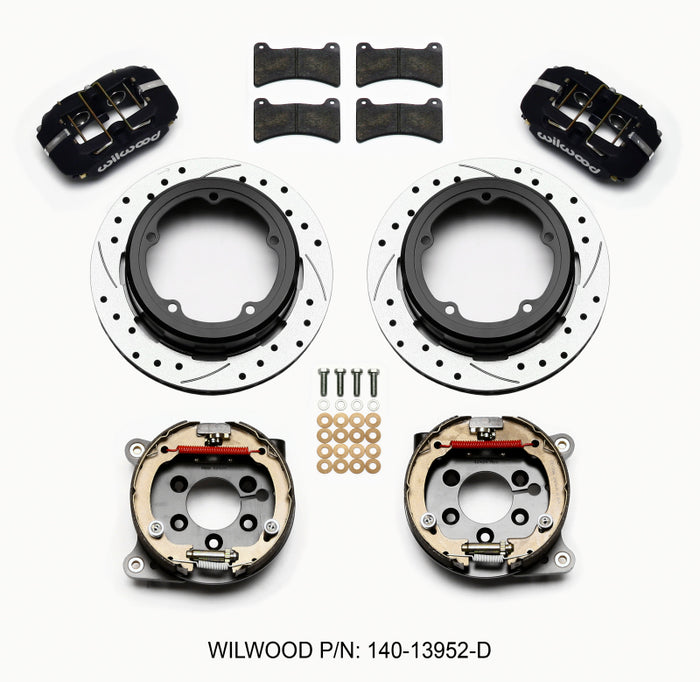 Forged Dynapro Low-Profile Pro-Series rear disc brake kits provide a complete solution for popular muscle car rear axles on applications that require a parking brake assembly and extra clearance for 14.00" to 15.00" rim applications. Forged billet Dynapro Low-Profile four-piston calipers 11.00" one-piece hat and rotor assemblies, and high friction pads provide optimized and balanced braking for all types of custom performance street/strip and show machines. The neatly hidden internal shoe system provides a clean installation with superior static holding power for parking. Optional caliper finishes and rotor designs enable the builder to personalize the style and optimize brake performance for every individual application.