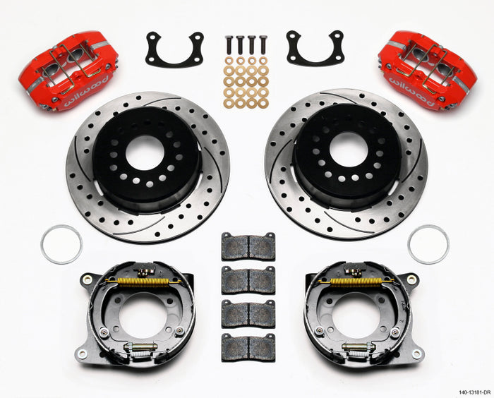 This group of DPL Pro-Series rear disc kits provides a complete solution for popular muscle car rear axles that require a parking brake. Forged Billet Dynapro Lug Mount four piston calipers, 12.19" one-piece drum/rotors, and high friction pads provide optimized and balanced braking for all types of custom performance street/strip and show machines. The neatly hidden internal shoe system provides a clean installation with superior static holding power for parking. Optional caliper finishes and rotor designs enable the builder to personalize the style and optimize brake performance for every individual application.