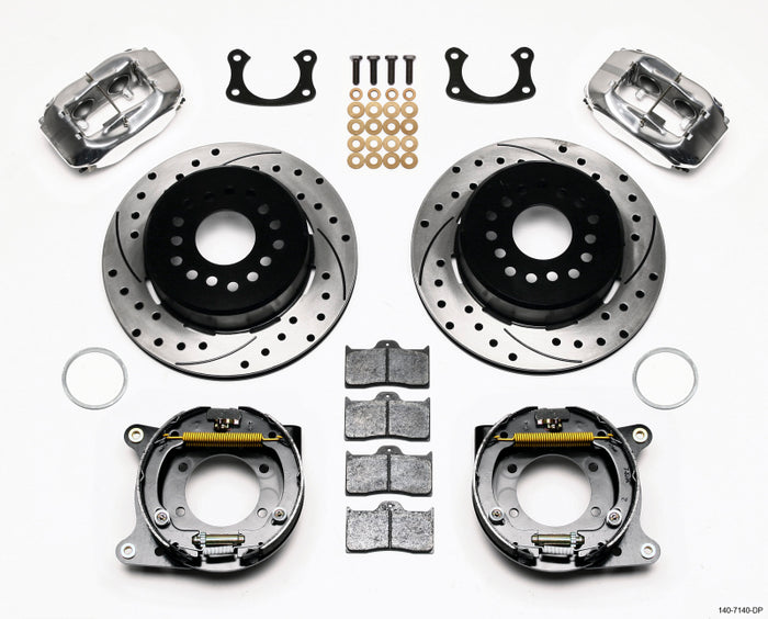This group of FDL Pro-Series rear disc kits provides a complete solution for popular muscle car rear axles that require a parking brake. Forged billet Dynalite four piston calipers, 12.19" one-piece drum/rotors, and high friction pads provide optimized and balanced braking for all types of custom performance street/strip and show machines. The neatly hidden internal shoe system provides a clean installation with superior static holding power for parking. Optional caliper finishes and rotor designs enable the builder to personalize the style and optimize brake performance for every individual application.