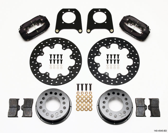 FDL Rear Drag kits are true bolt-on kits available for all popular muscle car rear axles and aftermarket rears built with custom axle ends. Kits in this group are purpose built for sportsman category door cars and others with full functional four-wheel disc brakes. Based on the specific style of housing end and axle offset, mounting kits securely install the four-piston forged Dynalite caliper over 3/8" plate steel rotors that are mounted to the axle with an aluminum hat. Standard kits include solid face rotors, with optional drilled rotor kits available to further reduce driveline weight in classes where every weight advantage is necessary.