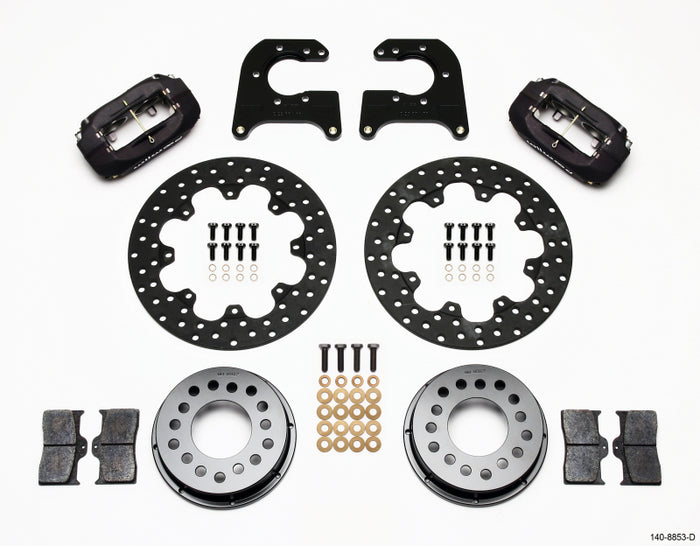 FDL Rear Drag kits are true bolt-on kits available for all popular muscle car rear axles and aftermarket rears built with custom axle ends. Kits in this group are purpose built for sportsman category door cars and others with full functional four-wheel disc brakes. Based on the specific style of housing end and axle offset, mounting kits securely install the four-piston forged Dynalite caliper over 3/8" plate steel rotors that are mounted to the axle with an aluminum hat. Standard kits include solid face rotors, with optional drilled rotor kits available to further reduce driveline weight in classes where every weight advantage is necessary.
