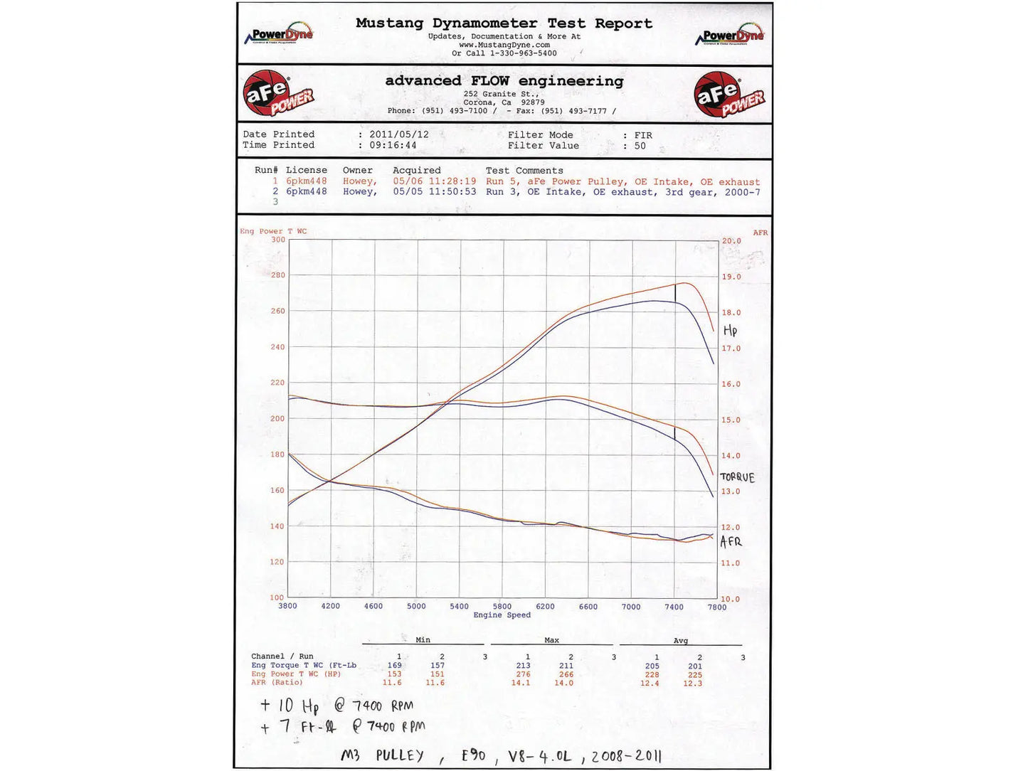 aFe Power's new power pulley brings performance engineering to your BMW M3. This power pulley is a complete bolt-on kit, including the pulley, bolts, and belts. aFe's power pulleys are CNC machined out of billet aluminum and black anodized for that aggressive look under the M3's hood. This power pulley does not modify factory harmonics or dampening. In recent Dyno testing this power pulley produced 10 HP and 7lbs. x ft. torque. aFe's power pulley fits up to production date May 2008. When it comes to engineering for power, performance, protection and value, aFe Power is the only choice.