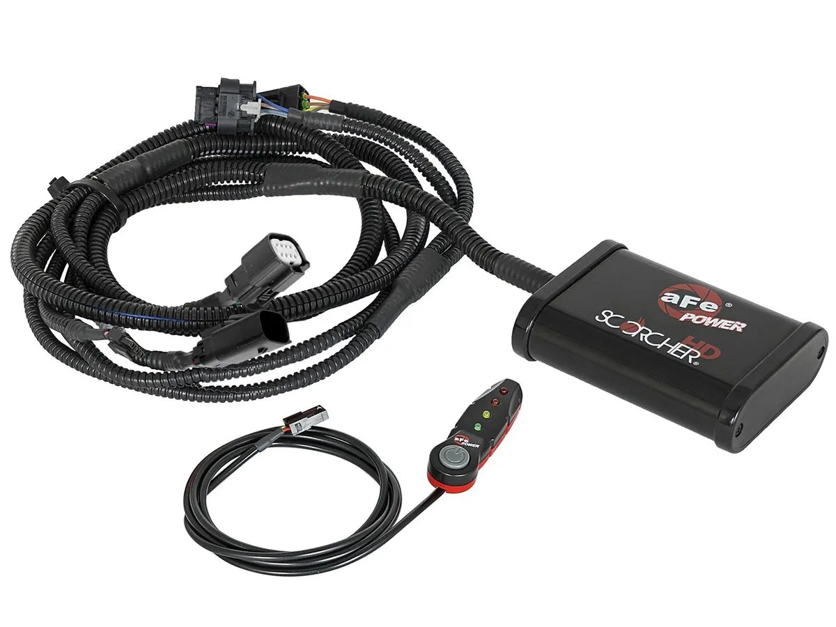 A simple 30 minute install will give you a huge increase in power. The aFe POWER SCORCHER HD Module includes a high quality case & wire harness with factory style connectors for an easy plug & play installation. A LED light switch provides In-Cabin On-The-Fly power adjustments. The 4-Power settings are adjustable with one button and the LED light represent the settings: Stock (Green), Sport (Yellow), Sport+ (Orange) and Race (Red) . This performance module increase turbo boost and fuel pressure. It improves vehicle performance and throttle response. This quick and easy plug & play SCORCHER HD module adds significant power by altering pressure sensor signals to increase turbo boost and fuel pressure to improve vehicle efficiency, power and throttle response. This module connects to the Manifold Absolute Pressure sensor and the Common Rail for a quick and easy installation. It is designed for light to medium everyday use with the occasional towing. For heavy duty use, please refer to part number 77-42013 that connects directly to the fuel injectors. SCORCHER HD modules features In-Cabin On-the-Fly power adjustment to accommodate any situation. This adjustment is controlled by via LED light switch with a button that can be easily mounted in any location in the cabin. aFe POWER SCORCHER HD modules uses high quality aluminum extrusion black powder-coated enclosure casing and factory style connectors which requires no modification to your factory harness. These factory style connectors, plugs directly into the stock wiring harness connectors and sensors. SCORCHER HD modules are 100% tested for proper protection. These modules work amazingly on stock vehicles and are optimized for maximum performance with use of aFe POWER performance products.