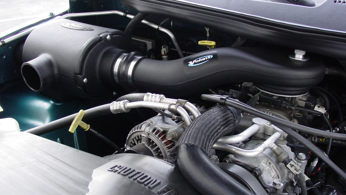 Volant air intake systems utilize a high-velocity venturi filter adapter which provides a smooth transition through the MAF sensor into the intake tube for a much needed airflow improvement over the factory rubber tubing and resonator box. Volant's Cool Air box is larger than the factory unit and incorporates a larger opening to collect a higher volume of colder ambient air.