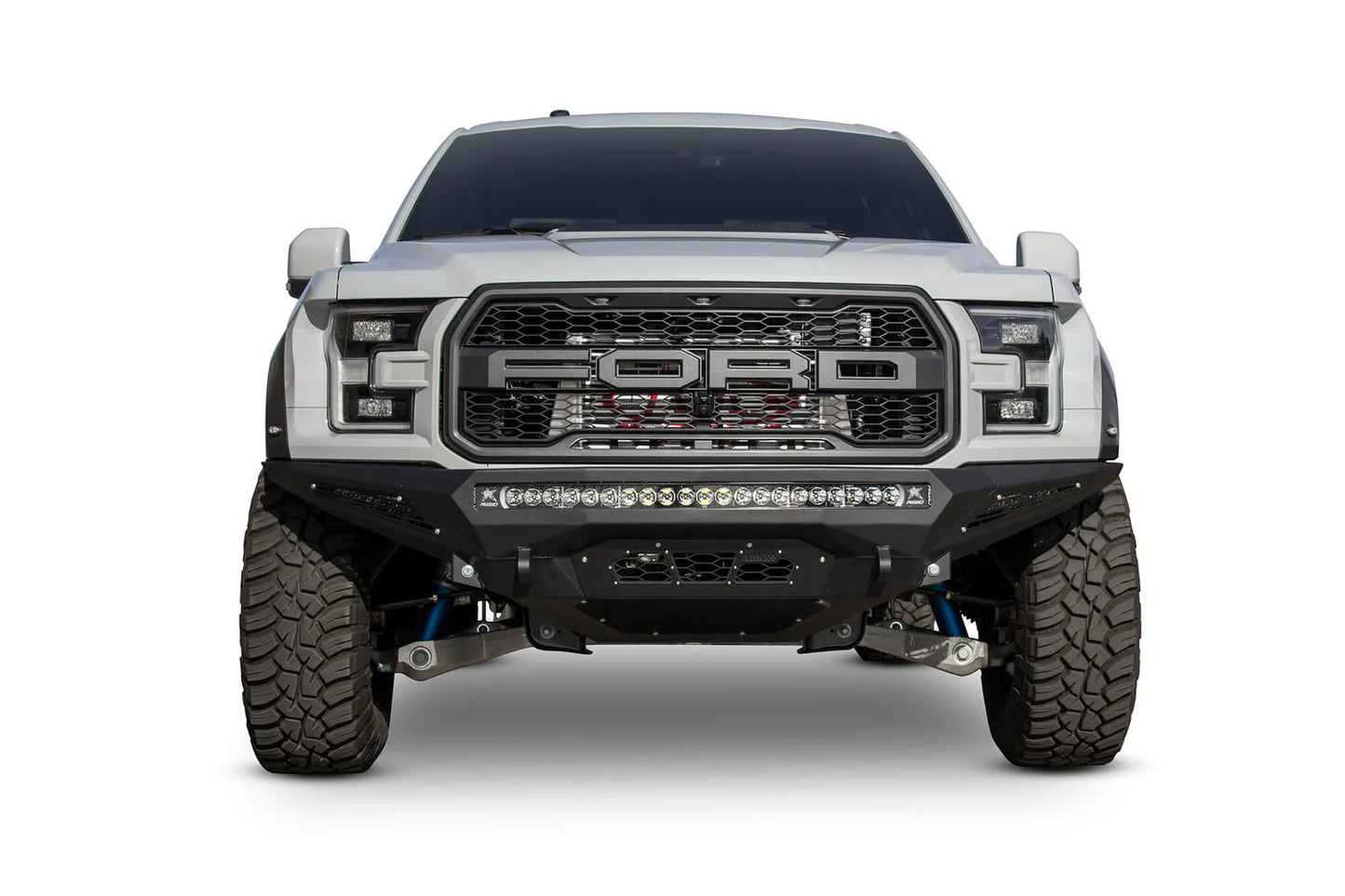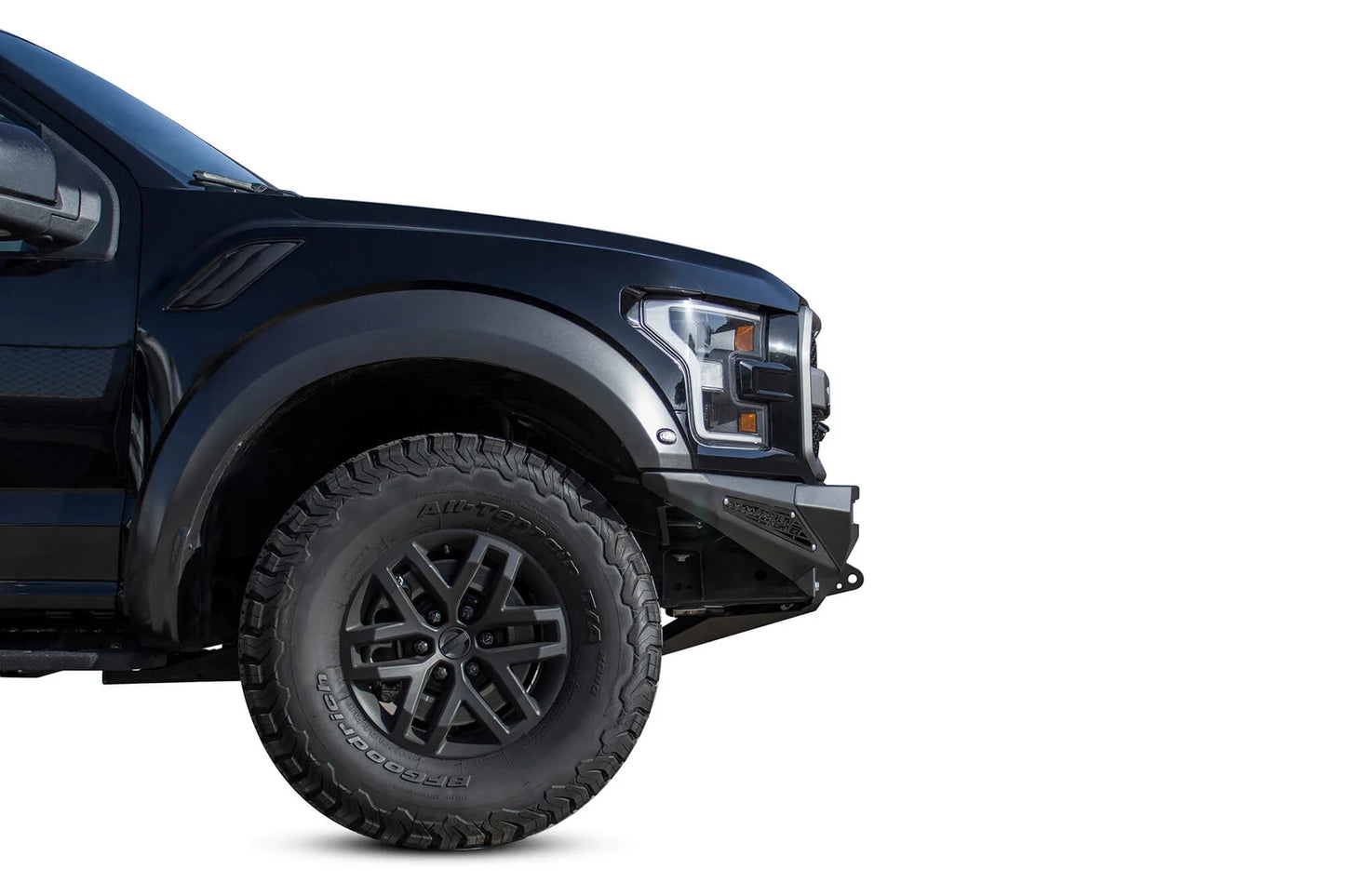 Addictive Desert Designs Stealth Fighter front bumper for the Ford Raptor is one of our tightest fitting and most aggressive looking bumpers on the market. Measuring only 1/2" farther from the grille than the factory bumper the Stealth Fighter gives your Raptor a tight fitting steel plate designed bumper.