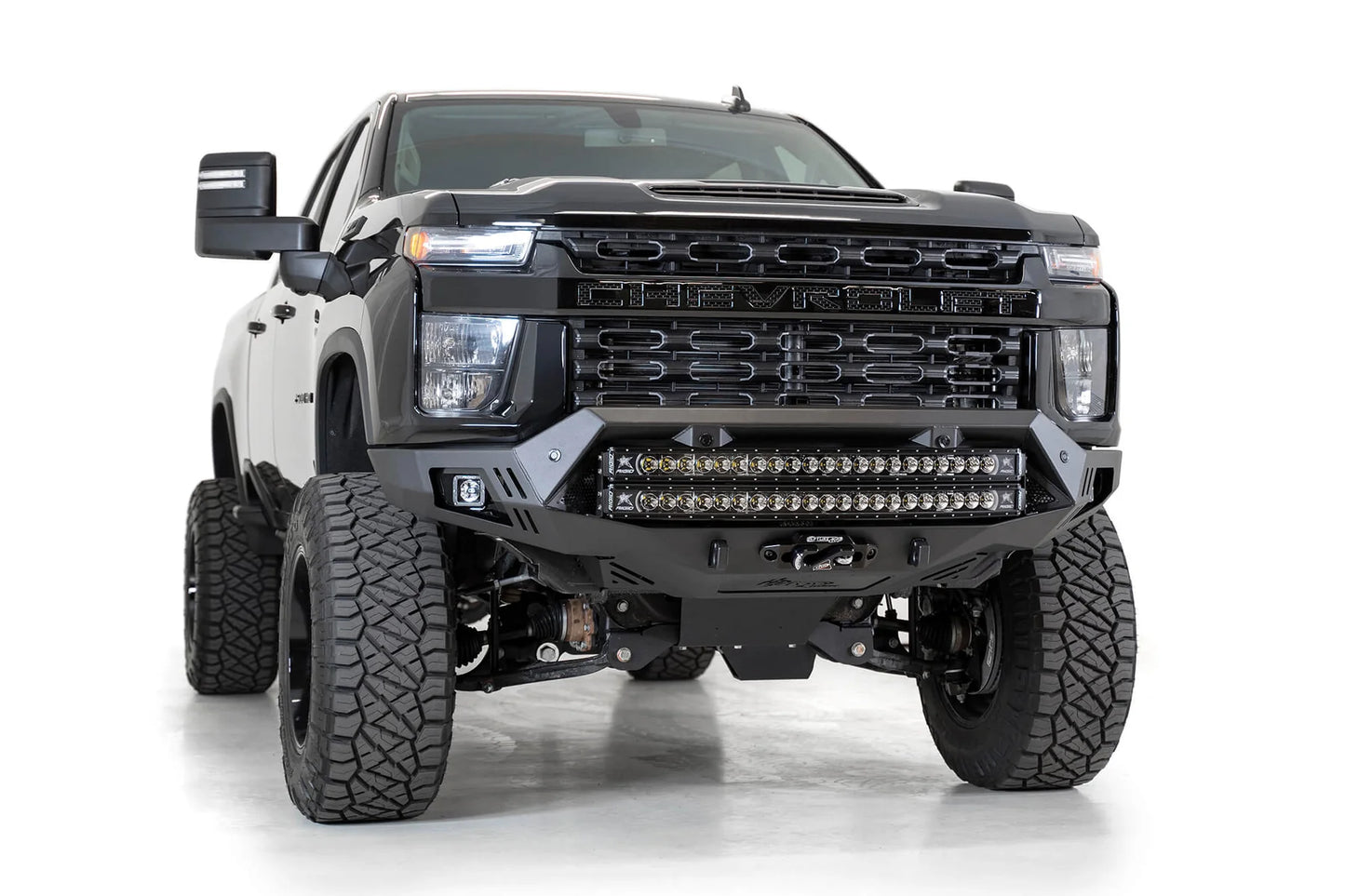 Heavy duty trucks call for heavy duty bumpers. The Chevy Silverado 2500 Bomber HD front bumper features a rugged plate steel design. A separate plate mounts your winch directly to the frame for unrivaled strength. Our reinforced clevis mounts provide a mounting point for soft shackles for more added utility.