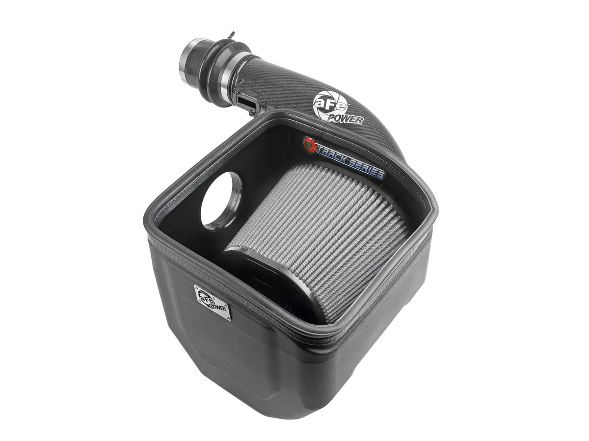 This 7†tall 360-degree radial flow air filter features a 5" flange and our oil-free Pro DRY S media with three layers of synthetic media for maximum convenience. Its progressive layering provides great filtration efficiency and dust holding capacity, while not requiring the use of oils. Its inverted top makes for more filter surface area, resulting in longer service intervals. This media is best suited for street use. This kit includes a Magnum SHIELD Pre-Filter to protect your performance air filter from large debris and water splash. The included massive air filter is surrounded by an open-element XLPE (cross-linked polyethylene) polymer housing that minimizes warm engine air for maximum performance. Its open design allows for easy viewing of the air filter and delivers an aggressive Air Intake sound. It connects to the vehicle’s factory air inlet with no additional hardware. The lightweight tube is computer-designed to achieve maximum power gains while maintaining a perfect fit. Manufactured from 100% twill weave carbon fiber, it features zero fiberglass and is clear-coated for the highest quality construction. This kit has a 53% weight reduction compared to the OEM intake. Stainless-steel clamps are included for strength, and premium silicone couplings allow for ample flexibility. Track Series intakes are designed with fewer parts for a fast and easy installation.