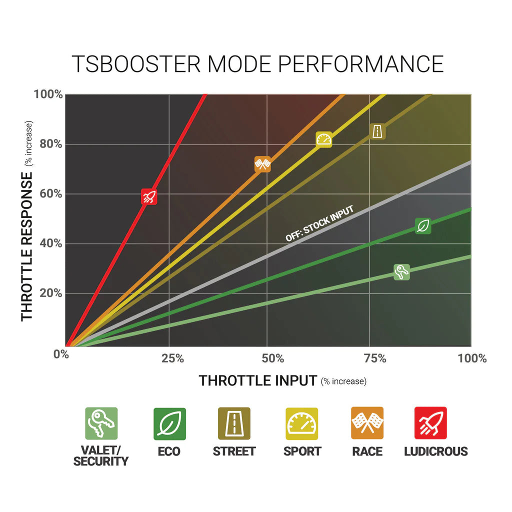 Say goodbye to that dead, laggy throttle pedal feeling and enjoy quicker engine response and acceleration with the BD Power TS Booster. The TS Booster amplifies the signal between the throttle pedal and ECM to give a quicker reaction time and forces your performance curve to occur sooner, achieving quicker engine response and a "fly back in your seat" feeling. Factory connections mean a painless install giving you six acceleration levels and a security mode. No need to program, the TS Booster sophisticated A.I. will do the work for you, learning the appropriate settings for your particular application from your throttle inputs. TS Booster doesn't affect warranty or tamper with emissions.