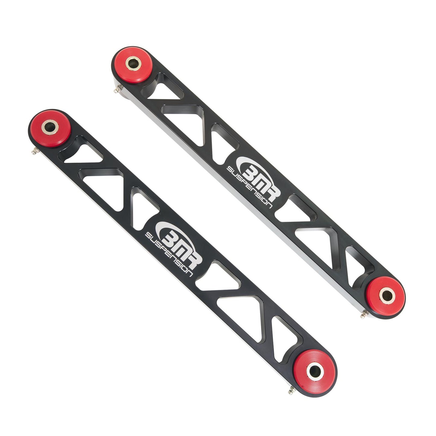 Launching harder, reducing wheel hop, and adding cornering consistency to your 2005-2014 S197 Mustang is easy with billet aluminum lower control arms from BMR Suspension. Stock stamped steel control arms with soft rubber bushings deflect under load and absorb power instead of transferring it to the tires. BMR’s billet aluminum polyurethane, non-adjustable S197 control arms (ACA004) are CNC-machined from 1.25x2.5-inch billet aluminum. This design gives you a strong, yet lightweight control arm that greatly improves performance. Two-inch greasable, 95-durometer bushings add a solid, more responsive feel over the stock rubber bushings. BMR’s bushings are internally fluted, which keep grease in the bushing, even under heavy load. These flutes also direct grease to the outer edge of the bushing, keeping the thrust surface lubricated. This efficient lubrication ensures quiet, reliable operation over the life of the bushings. BMR Suspension designed the ACA004 to work well in street performance, drag race, and road race applications. The stock control arms flex under heavy cornering loads giving you inconsistent handling characteristics. Couple this with soft bushings that have massive amounts of deflection and you’re left with poor performance. The ACA004’s heavy-duty construction eliminates control arm flex, giving you much better repeatability on the street, starting line, or in the corners. BMR’s polyurethane bushings are designed to be compliant enough to give you a comfortable ride and absorb NVH, while remaining firm enough to stand up to high loads of any performance environment. The bushings easily handle the high compression loads of hard launches and acceleration, yet offer plenty of articulation for great handling. These are the perfect upgrade for the enthusiast looking to improve performance, while maintaining acceptable NVH levels and ride quality. When performance is a must, rely on BMR Suspension! BMR Suspension’s ACA004 Billet Aluminum non-adjustable polyurethane lower control arms are available in a black anodized finish for long-lasting good looks. Installation time is about 1-2 hours. Proudly made in the U.S.A.