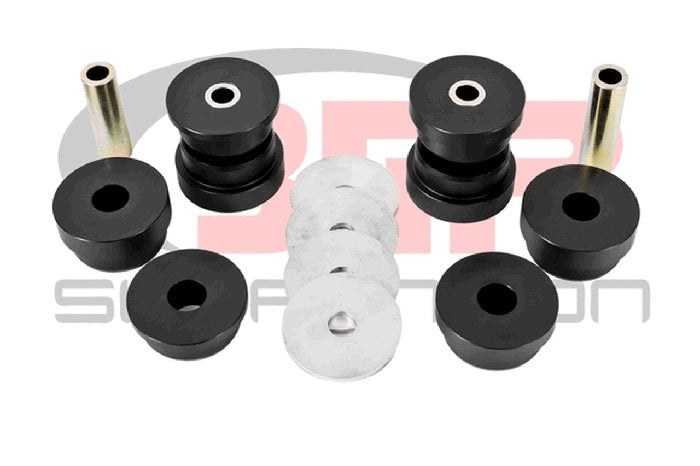 Eliminate rear cradle movement in your S550 Mustang with a Aluminum Rear Cradle Bushing Kit from BMR Suspension. The OE bushings are designed with air pockets and are made from soft rubber. These “voids”, coupled with soft material produce excessive rear cradlel movement during normal and aggressive driving. These bushings are CNC-machined from Aluminum, which is known for its high stiffness, low friction and excellent dimensional stability. This material eliminates deflection with only moderate increases in NVH. Each bushing is machined to exact tolerances, which are designed by BMR. This allows for a perfect fit and increased performance for any driving style. The BMR Aluminum Rear Cradle Bushing Kit (BK048) greatly increases the rigidity and stability of the chassis to provide maximum control and consistency necessary for any form of competition or high performance street driving. Designed for max effort street performance, drag race, and handling applications, BMR Suspension BK048 Aluminum Cradle Bushings are the perfect wheelhop solution for any S550 Mustang where NVH is not a concern. BMR’s Aluminum cradle bushings replace the entire OE rubber bushing, eliminating differential movement by replacing the soft rubber OE bushings with solid two-piece Aluminum bushings. These bushings remove all movement between the rear cradle and chassis, eliminating the deflection that occurs during acceleration, cornering, and braking. This reduces wheelhop and increases handling stability, while giving you a much-improved overall feel in any performance driving situation. BMR Suspension’s BK048 Aluminum Rear Cradle Busing Kit is available in black. Installation time is about 3-4 hours and may vary depending on stock bushing removal technique. Proudly made in the U.S.A.!