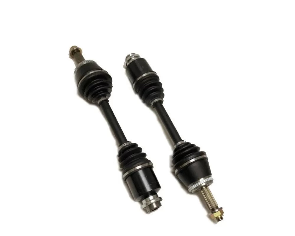 These are the Level 2 Front axles for the Evo VII / VIII / IX. The Level 2 axles for the Evo feature aerospace grade 32 spline, up from the factory 30 spline, torsional axle bars with our special double temper process, billet inner and outer CV's and are a direct bolt-in to the factory hubs. We have recently updated the design with a new 2-piece outer CV housing and a 300m stub shaft. These axles are complete and ready to install.